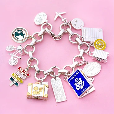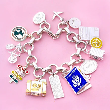 Charm bracelets are a timeless way to tell your own unique story and are the ultimate expression of personalized jewelry. We offer a range of charm bracelets at different price points that allow you to mix and match your different charms to tell your own personal travel-themed story. All of our charm bracelets are made with precious metals including sterling silver (with 925 purity), gold vermeil (sterling silver coated with a heavy layer of 14k gold), and solid 14k gold.