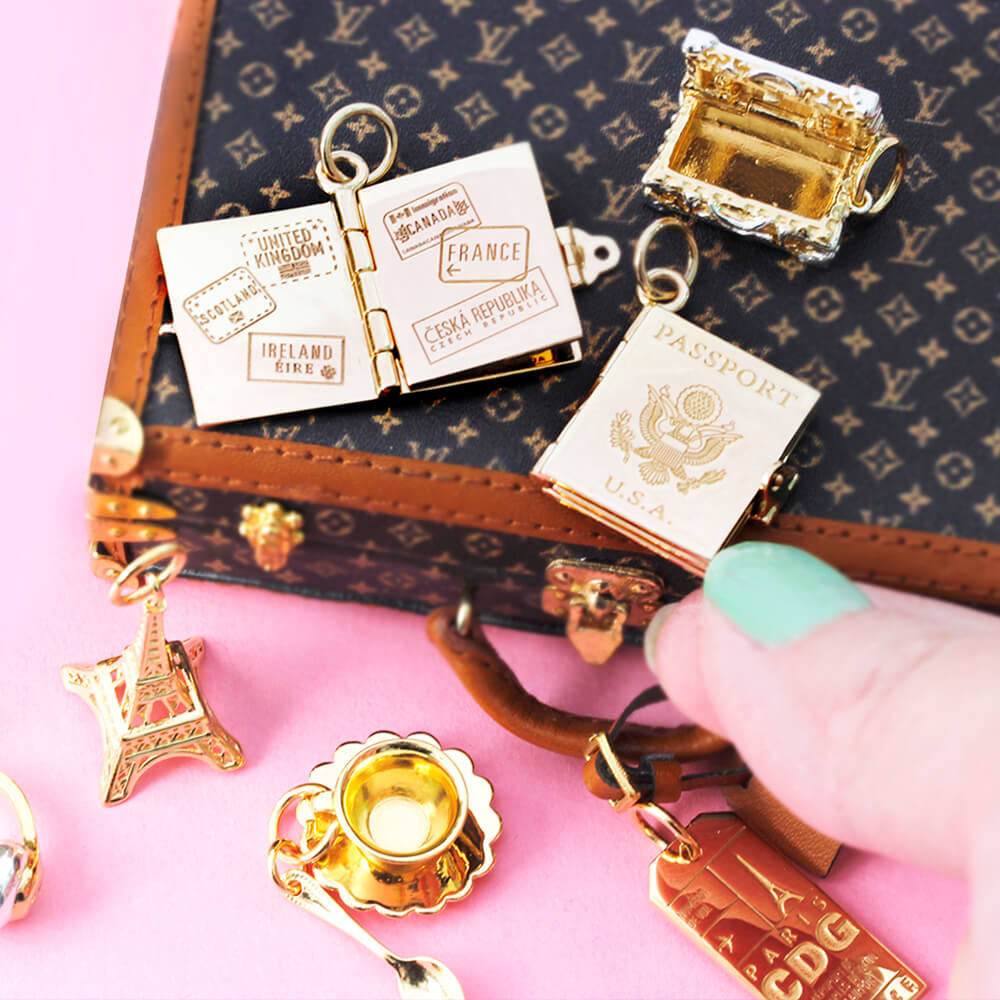 Inspired by actual airport luggage tags. | Our most popular city charms in mini. | Inspired by actual stamps in your passport book. | Our most popular country charms in mini. | Real-world objects, reimagined in mini 3D. | Mini versions of our most-loved charms. | Your details on charms inspired by the real thing. | The sailor's alphabet, reimagined in charm form. | Mini versions of all our nautical flags. | Iconic souvenirs of the parks you love. |