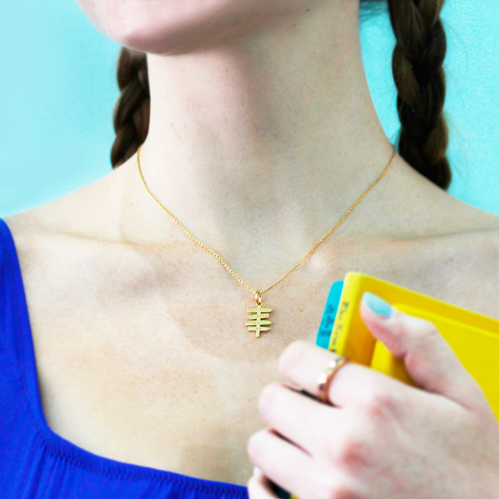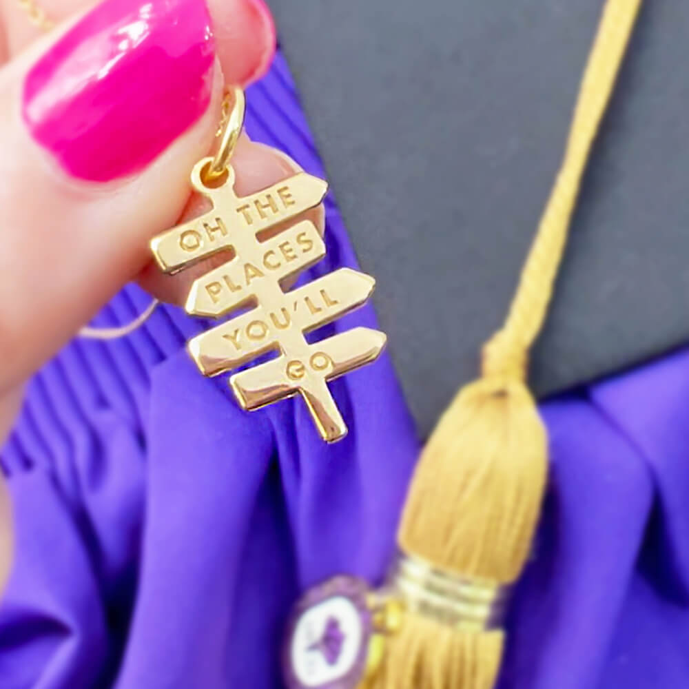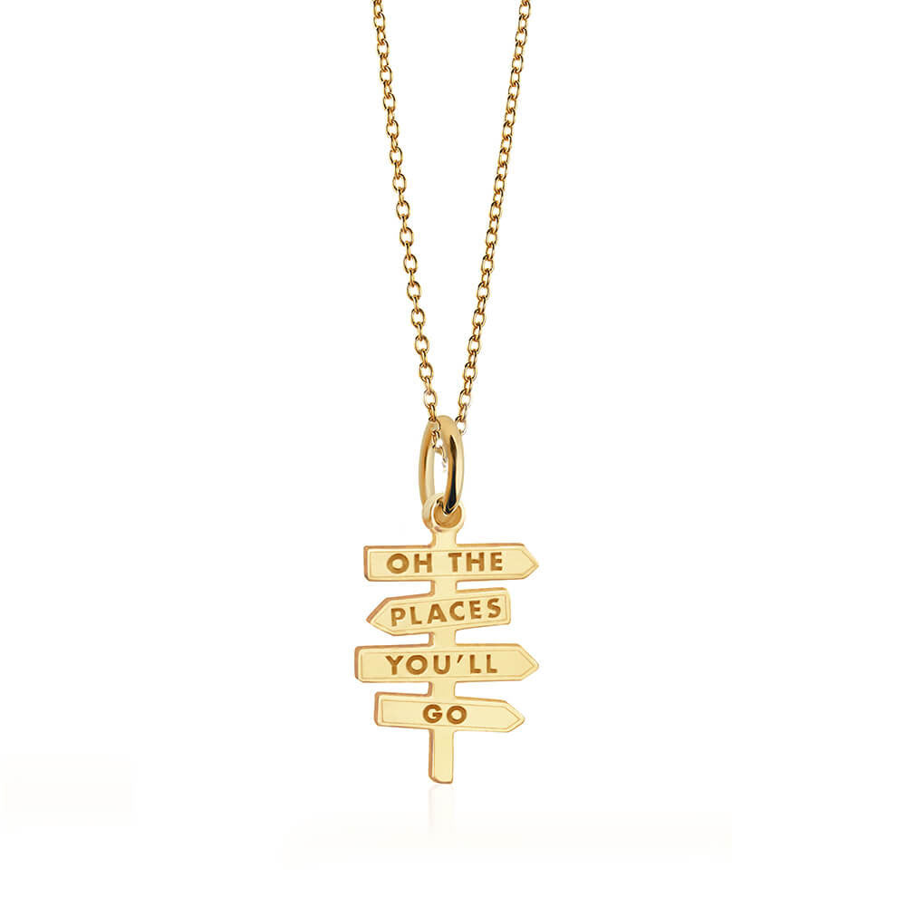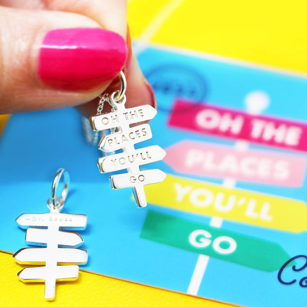 This 14k gold vermeil charm features the titular line from Dr. Seuss’s much-quoted book. “Oh, the places you’ll go” is engraved in bold letters across a playfully askew 4-tiered directional sign. The author himself is credited on the back.