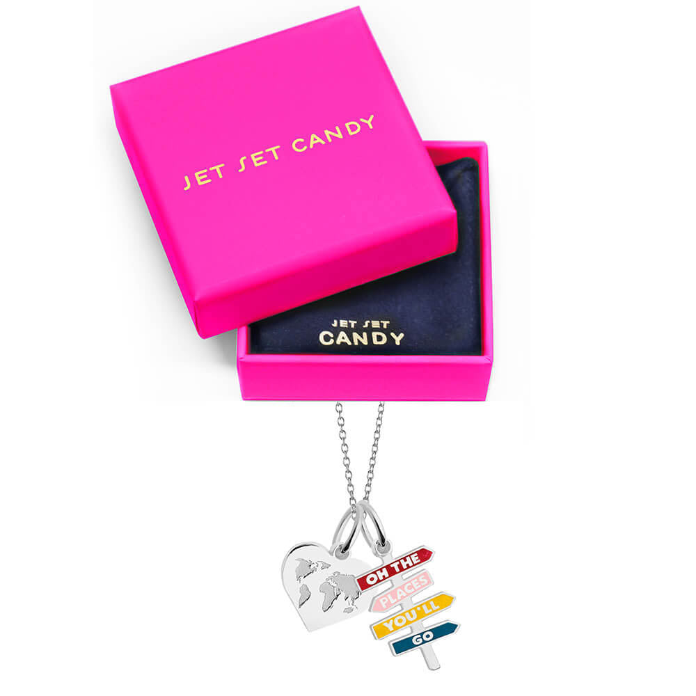 They’re destined for great things and you’re right there to support them. The titular line from Dr. Seuss’s much-quoted book, “Oh, the places you’ll go” is etched across a playfully askew 4-tiered directional sign with the author himself credited on the back. The boldly colored sterling silver enamel charm is styled on a classic adjustable 14-16” cable chain, perfect for jetsetters of all ages.