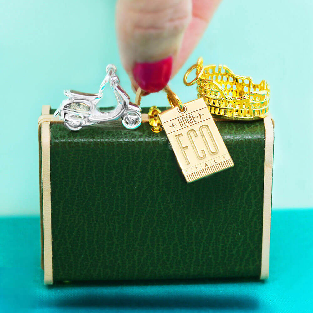 Inspired by actual airport luggage tags. | Our most popular city charms in mini. | Inspired by actual stamps in your passport book. | Our most popular country charms in mini. | Real-world objects, reimagined in mini 3D. | Mini versions of our most-loved charms. | Your details on charms inspired by the real thing. | The sailor's alphabet, reimagined in charm form. | Mini versions of all our nautical flags. | Iconic souvenirs of the parks you love. |