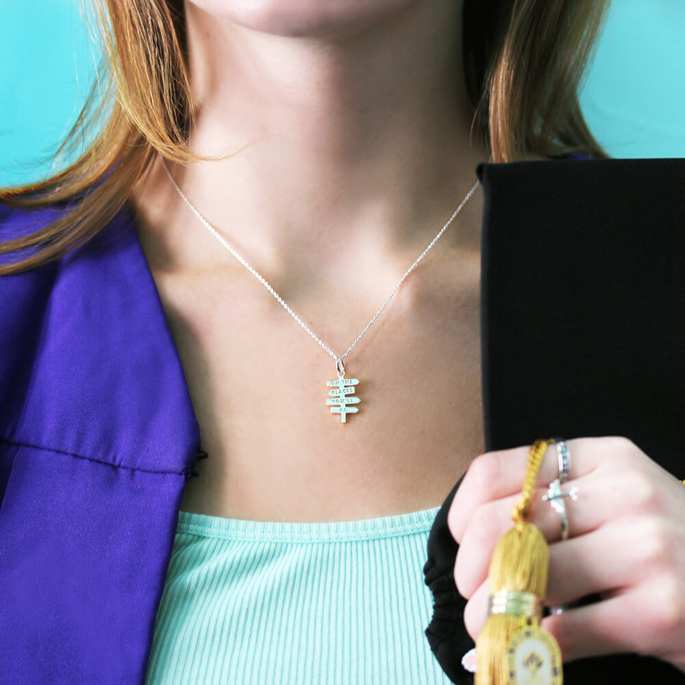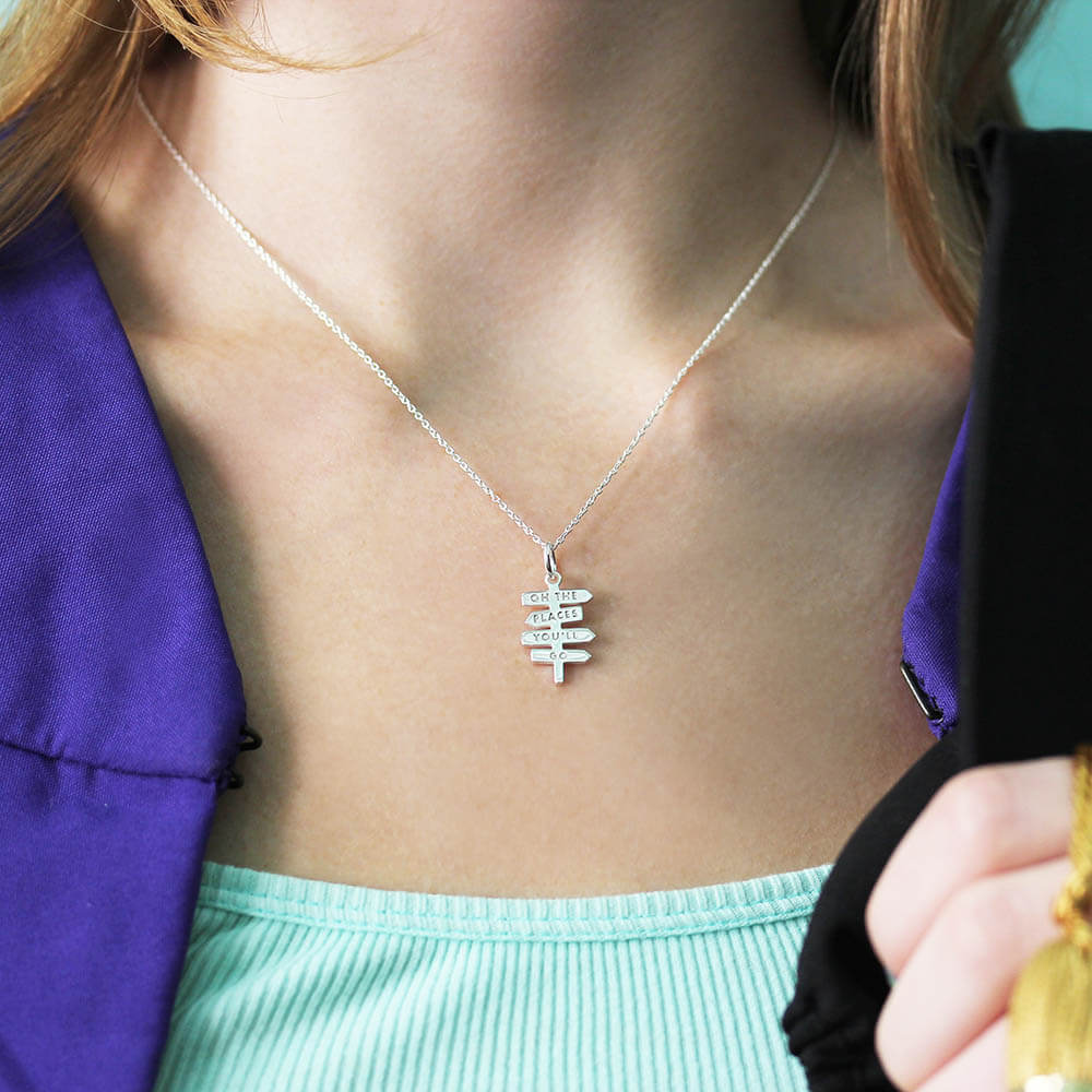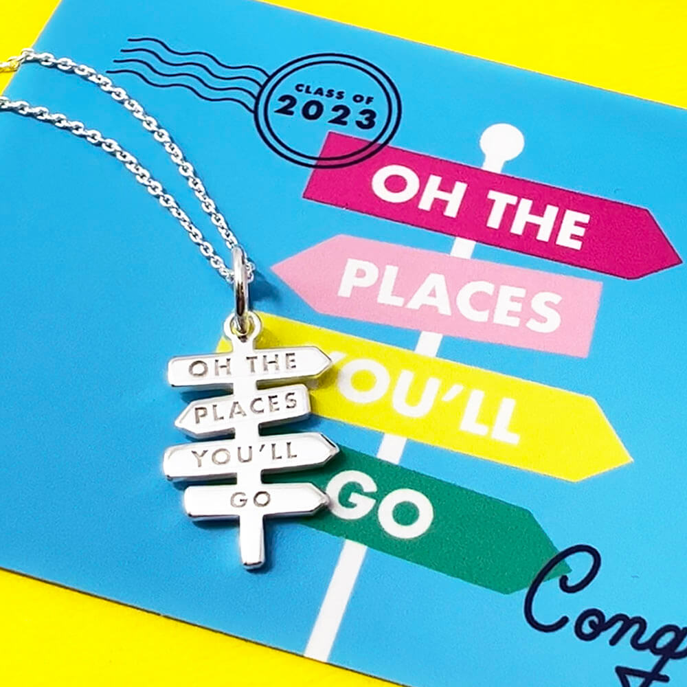 This 14k solid gold charm features the titular line from Dr. Seuss’s much-quoted book. “Oh, the places you’ll go” engraved in bold letters across a playfully askew 4-tiered directional sign. The author himself is credited on the back.